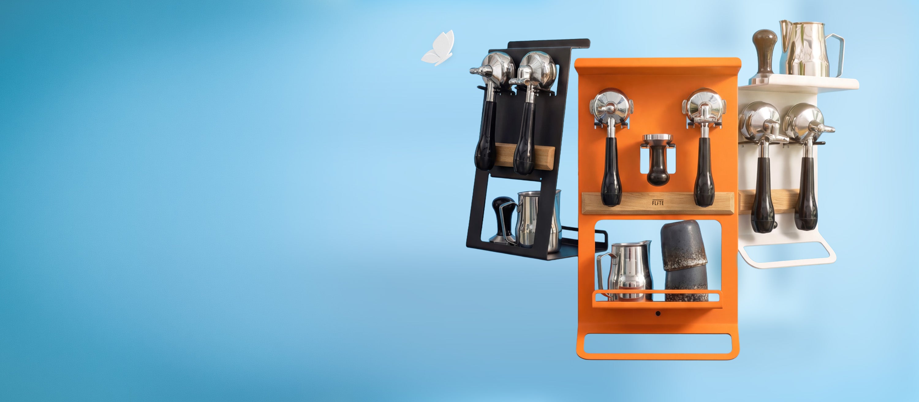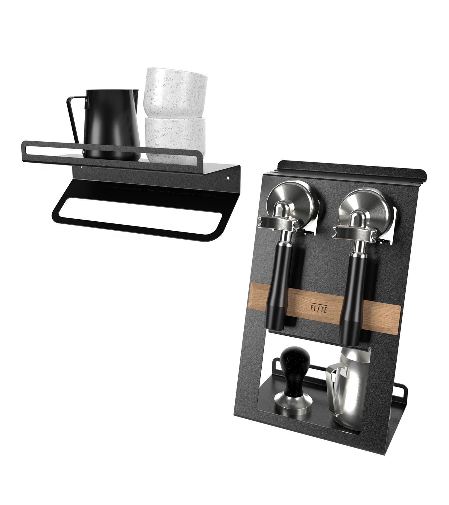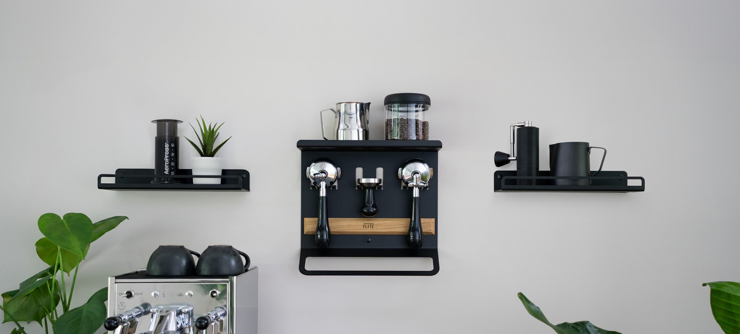 Las estanterías FLATE® Barista ponen orden en su barra de café, independientemente de la máquina que tenga o del espacio del que disponga. Disponibles en dos tamaños diferentes, encontrará los soportes y las opciones de almacenamiento que necesita.