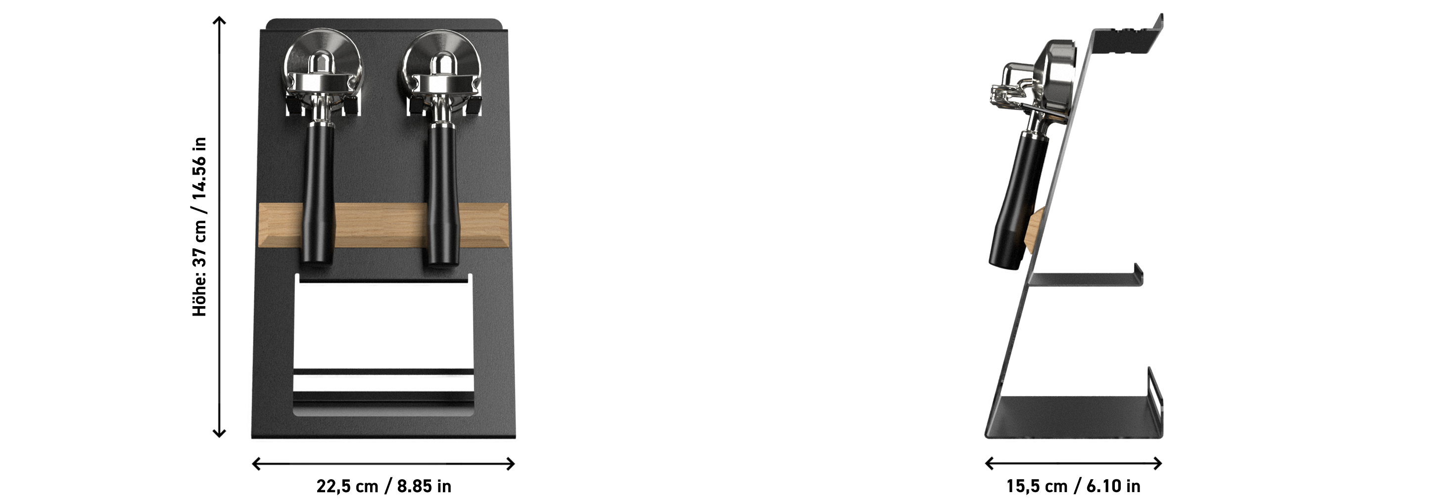Découvrez la FLATE® Barista Station: votre station pour porte-filtre et accessoires barista. La solution optimale pour organiser parfaitement votre coin café ! Le compagnon idéal pour la routine quotidienne du café, en particulier pour les amateurs de café disposant d'un espace limité. Ce support est un incontournable absolu qui établit de nouvelles normes pour l'organisation de votre coin café et élimine le besoin de montage mural. Notre support est conçu pour s'adapter à tous les modèles de porte-filtres standard, y compris les machines E61, Sage, De'Longhi, Bezzera, Rocket et bien d'autres.
